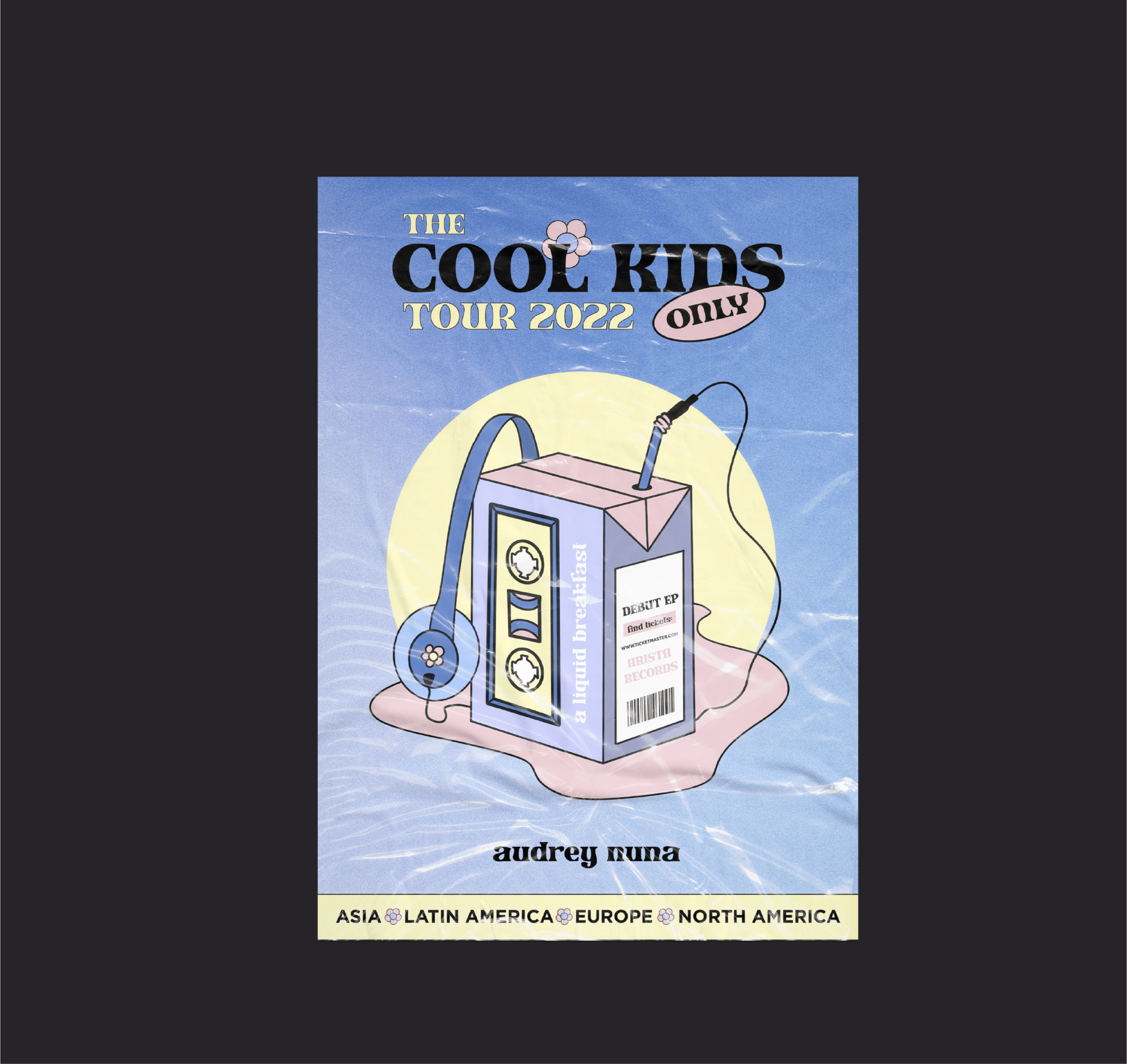 "A liquid breakfast" Album is the debut EP of the uprising R&B artist and rapper Audrey Nuna. This project aims to create a brand identity for the new album that includes designing the album cover, merch line, and promotional poster for her upcoming world tour—targeting young adults interested in and enjoying R&B and hip-hop music.