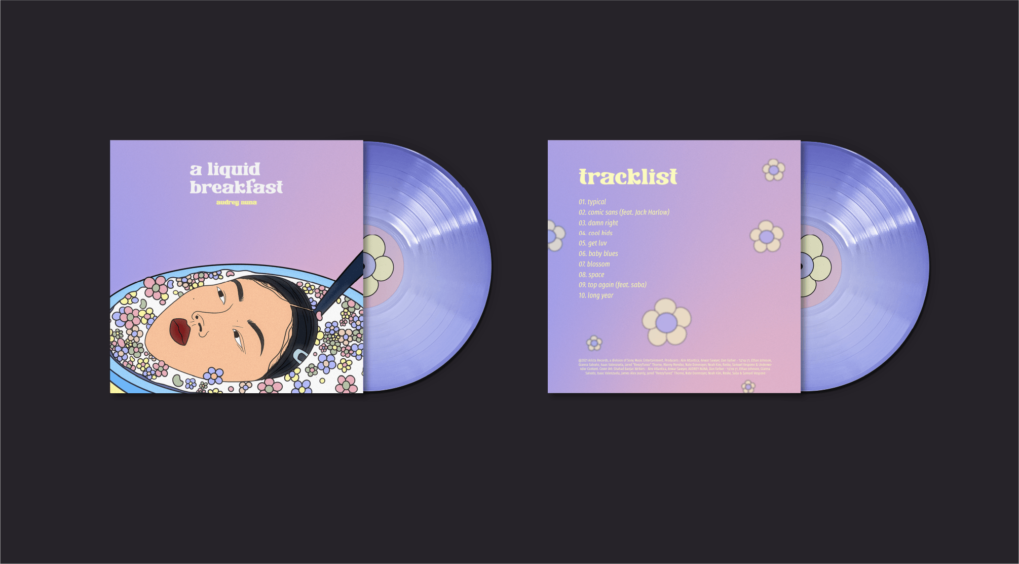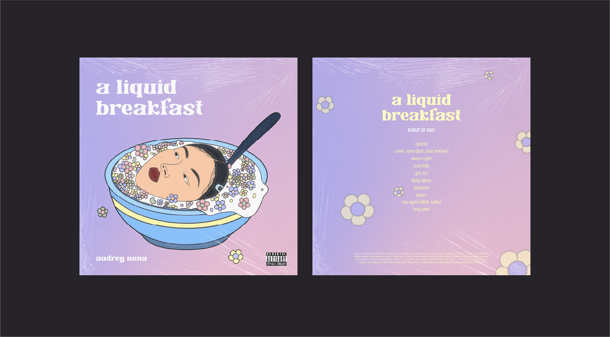 The album's visual identity revolves around her experimental sound of music and her visual aesthetics. The illustration showcases Audrey's face in a bowl of cereal as a foreshadow to her album name "a liquid breakfast" and the colorful coral as a metaphor for her diverse and experimental melodies. Pastel colors were mainly used to showcase the lightness and haziness of the overall vibes of the album. Moreover, the type choice for the album title is quirky and unique to match and connect all design elements.